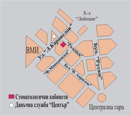 На приложената схема е обозначено местоположението на дентална практика "Ралев Дентал АД" в гр. Пловдив. Според д-р Маркова схемата е доста неясна, а според други лица от женски пол - тотално неразбираема. Според Венцеслав Ралев въпросният градоустройствен план ще бъде неясен за 91.4 % от жените поради присъщото на женския пол чувство за пространствена дезориентация :-))). Умоляваме дамите да не се засягат, все пак д-р Бучкова успя да се ориентира по схемата за около 5 секунди. Ако не можете да се ориентирате за местонахождението на нашия кабинет, тръгнете от кръговото движение на централна гара по бул. "Васил Априлов", завийте по четвъртата пресечка вдясно и после - по първата отново вдясно. На ъгъла на улиците "Любен Каравелов" и "Радецки" има заведение за бърза закуска (ще искаме от собствениците процент за рекламата), до него - магазин, а до него - магазин за крепежни изделия "Нина 88" (от много хора вече трябва да взимаме процент). До крепежните изделия е входът на кооперацията, в която се намира нашата дентална практика. Има портиер - обикновено доста приказлив, който също би могъл да ви упъти. Ако се качите на петия етаж, ще забележите една светеща табела, под която е нашата входна врата. Екипът на дентална практика "Ралев Дентал" искрено се надява да останете доволни от първото си посещение при нас и да научите наизуст пътя до кабинета :-)))! За нас основната цел е стопроцентовото удовлетворение на пациента. Поради това се стремим да поддържаме и приятна обстановка в кабинета.