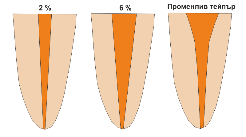Схема на различните тейпъри (степен на заостреност) на ендодонтските инструменти, с които и се получава съответният тейпър при механичната обработка на канала. При зъбния корен вляво е показан тейпър от 2 % - това са първите канални инструменти, които са въведени в стоматологията и все още се използват най-често в цял свят. С тях в огромна част от случаите е възможно да се получи напълно адекватна механична обработка на канала, стига зъболекарят да положи необходимите усилия и старание за това. Необходимо е каналът да се разшири достатъчно - в случай че се започва с лилав инструмент, да се разшири поне до черен. Така се премахват всякакви разпаднати материи в каналната система на зъба и се получава до голяма степен унифицирана форма на напречното сечение, близка до кръг - виж графичната схема по-долу. Някъде през 2000 година в практиката започнаха да се прилагат ендодонтски инструменти с по-голям тейпър (коренът по средата) - 4 %, 6 %, 8 % и дори 10 %. Според различни клинични проучвания с тях се получава доста по-добър резултат - статистически повечето коренови канали са заострени като фуния и най-много се доближават до тейпър от 6 %. В други случаи пък (значително по-рядко) се използват инструменти с по-малък тейпър - например 1.25 % при разширителя Pathfinder на Cybron Endo. Те се използват за преодоляване на калцификати и различни стеснения по хода на канала - като се разчита че поради почти нулевата си степен на заостреност инструментът ще премине покрай стеснението и ще навлезе в дълбочина, което и в много случаи се получава на практика. При тейпър от 6 % каналът се почиства идеално, при оглед с микроскоп се вижда една чиста стена от орефициума до апекса. Проблем представлява обаче честото преразширяване на апикалния отвор, при което рязко нараства опасността от излизане на сийлъра и гутаперковия щифт извън кореновия канал - в пределите на периодонциума. Поради това към края на първото десетилетие на XXI век започна масово приложение на машинни ендодонтски инструменти, с помощта на които се получава променлив тейпър - както е показано на схемата горе вдясно. Някои лектори с повече въображение оприличават тази форма на канала на Айфеловата кула. Тъй като далеч не във всяка практика по света има наличен ендодонтски мотор, повечето производители започнаха да предлагат подобни канални инструменти и за ръчна употреба. Предимствата на променливия тейпър добре се виждат на схемата горе - орефициумът е добре разширен, което осигурява отличен достъп към кореновия канал в дълбочина. Освен това в областта на самия орефициум много често се откриват разширения и извивки, които са изпълнени с разпаднати материи - при този метод за механична обработка последните се почистват и не остават като потенциален източник на инфекция. Същевременно апексът не е преразширен и няма толкова голяма опасност от чисто механично увреждане на периодонциума или припресване на каналопълнежни пасти или сийлъри.