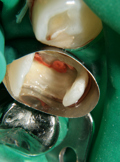 Три шиечни кариеса са почистени и в кавитетите е нанесен ецващ гел. Не е поставен кофердам - няма как гуменото платно да навлезе субгингивално в областта на третия и четвъртия зъб. Много зъболекари препоръчват в такива случаи да се изреже ивица от венеца с височина 1 - 1.5 мм, след което да се постави кофердам. Според нас това е излишна травма в повечето случаи, а и е предпоставка за венечна рецесия в бъдеще - primum non nocere! На горна челюст слюнката се стича надолу и не представлява проблем; ако от венечния джоб изтича кривикуларна течност, може да се контаминира ецваната зъбна повърхност и да се компрометира реставрацията. В такива случаи много автори препоръчват зъбният венец да се намаже с адреналин, да се инжектира с адреналин или с местен анестетик със спринцовка за интралигаментарна анестезия. Адреналинът свива съдовете и подтиска ексудацията на гингивален секрет.