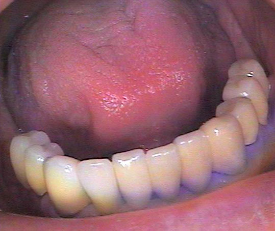 На тази снимка е представен пациент с керамична конструкция на долната челюст - единадесетчленен мост. Долните централни резци умишлено не са подредени под формата на идеална зъбна дъга; вижда се неравномерната линия на режещите им ръбове и леко изразените аномалии в местоположението на отделните зъби. Конструкцията беше изработена по този начин по идея на нашия зъботехник и пациентът беше изключително доволен от нея - на практика за всеки непрофесионално настроен страничен наблюдател зъбите изглеждат съвсем като естествени. Няма онова впечатление за изкуственост, което се създава от равномерно подредените зъби.
