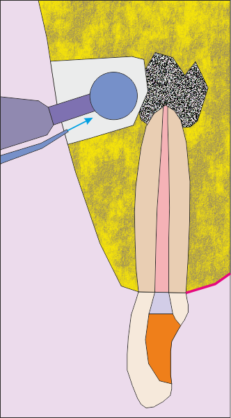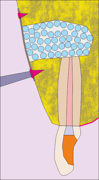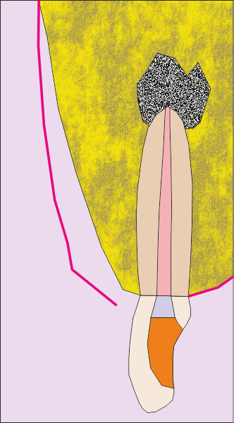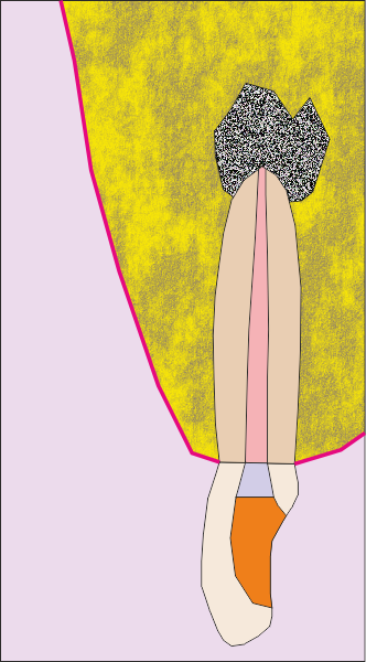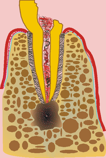 Първоначална ситуация - схема на хроничен локализиран или дифузен периапикален периодонтит, който подлежи на апикална остеотомия. Около апекса на зъбния корен се формира кухина, изпълнена с разпаднати тъкани и клетки на хроничното възпаление. На схемата горе тази кухина е означена с черно - бяла текстура. В огромен процент от случаите оперативният достъп се осъществява от вестибуларна посока - при което понякога се изисква отнемането на много голям костен обем, особено при долни странични зъби.
