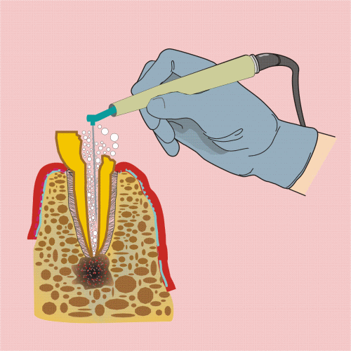 През последните няколко десетилетия обаче ултразвукът намери сравнително широко приложение и в ендодонтията - за разширяване и почистване на кореновите канали. При него се използва каналоразширител, прикрепен към ултразвуков накрайник. Разширителят трепти с ултразвукова честота и почиства канала, т.е. движението включва единствено трептения и инструментът не се върти. Същевременно накрайникът разпръсква вода (белите мехурчета), което оказва допълнително почистващо действие. Според личните впечатления на нашия екип по никакъв друг начин каналът не може да се почисти толкова добре - когато след това се прокара обикновен инструмент по дентиновата повърхност, се усеща твърдост. При другите методи се усеща наличието на размекнат, размазан дентинов пласт. След окончателното почистване на кореновия канал с ултразвуков инструмент е добре да се извърши промивка с лимонена киселина - тя е доста по-слаба от ортофосфорната киселина на ецващия гел, но осигурява допълнително разтваряне на последните остатъци от размазания пласт и като следствие - окончателно почистване на стените на канала. По своята същност това представлява едно много повърхностно ецване - не в дълбочината и в обема, който се изисква при адхезивния протокол, но с нищо по-различно като процес.