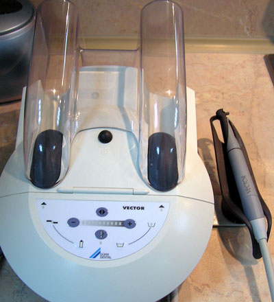 При лечение със системата "Вектор" същността на процедурата е следната: съчетават се ултразвукови трептения на накрайника с впръскване на абразивен прах в пародонталния джоб. При това се почиства и кореновата повърхност, и мекотъканната стена на джоба. При всеки увреден пародонт по кореновата повърхност има некротичен зъбен цимент, подвенечен зъбен камък, плака и най-вече множество микроорганизми. Всичко това се почиства отначало с ултразвук, който премахва големите натрупвания. След това, на следващо клинично посещение, се обработва допълнително с "Вектор" и кореновата повърхност се заглажда на микрониво. Съществено е предимството на апарата в друг аспект: с него се заглажда не само кореновата, но и мекотъканната повърхност на джоба. Това не е възможно да се постигне с нито един друг апарат до момента; възможно е меките тъкани да се почистят чрез ръчен кюретаж, но чрез "Вектор" почистването е много по-бързо и качествено. Отстраняват се възпалителните гранулации (съединителна тъкан, инфилтрирана с клетки на имунната система и голямо количество микроорганизми) и се получава повърхност от здрава тъкан, която прилепва към зъба и сраства с кореновата повърхност. Повече по въпроса...
