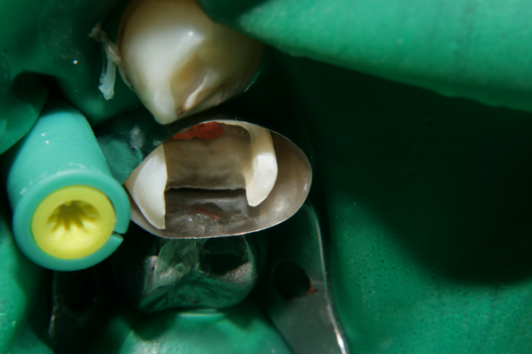 Ецващият гел е промит с обилна водна струя и кавитетът е подсушен. При правилно изпълнение на процедурата зъбната повърхност побелява - налице е тебеширенобял цвят. Вижда се и цепнатина между гутаперчата и стената на канала - ецващият гел е разтворил епоксидния сийлър, което от гледна точка на ендодонтията представлява клинична грешка. Топендодонтите съветват винаги урефициумите на запълнения канал да се изолират с течен композит, компомер или глазйомерен цимент. Може би най-удачен за такива ситуации е самоецващият композитен цимент - например Diamond Link на DRM (САЩ). В настоящата ситуация веднага ще бъде аплицирана свързваща система, която ще навлезе в дълбочина чрез дифузия и ще запечата канала, поради което едва ли ще възникне ендодонтски проблем в бъдеще; все пак, необходими са повече изследвания занапред по настоящата тема - до каква дълбочина ецващият гел извлича кореновия сийлър и дали това създава опасност от нарушаване на запечатката на канала.