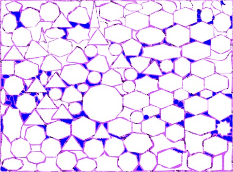 На тази схема е направен донякъде успешен опит да се представи строежът на материала. Вижда се много плътното запълване с неорганични частици - белите и сини многоъгълници. При нанохибридите сред частиците на неорганичния пълнител са разпръснати частици със същия състав, но с много малък размер - от порядъка на 40 nm. Оттук идва и названието нанохибриди - хибрид означава материал с различен размер на частиците на пълнителя, да не се бърка с хибридните атаки и хибридните войни на някои авторитарни режими срещу Западния свят. Поради различния размер на частиците те се подреждат в пространството много плътно една до друга, поради което Grandio (Voco - Германия) се характеризира с най-висок процент на неорганичния пълнеж от всички произвеждани композити - до 82 %. Това е причина и за голямата механична здравина на материала. Според проучвания на независими автори материалът показва може би най-добрите механични качества от всички композити, произвеждани до момента: