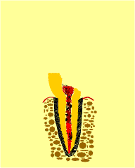 На тази схема е показана първата стъпка при обработката на каналите - почистването на канала от живия съдово - нервен сноп или от остатъците от вече умъртвения нерв. Това почистване се извършва с помощта на нервекстрактор, чиито шипчета захващат меките тъкани и ги изтеглят навън. Накрая каналът е вече чист, след което следва неговото разширяване. При витален зъб тази манипулация е необходимо да се извършва под местна анестезия, тъй като зъбната пулпа е изключително чувствителна и при липса на адекватно обезболяване би се явила непоносима болка. В миналото широко се е прилагало медикаменозното девитализиране на зъбната пулпа (най-вече с арсенови препарати), но днес това почти не се прилага - в целия Европейски съюз арсенът за зъбна девитализация няма разрешение за употреба като лекарствен продукт в нито една страна. При некротична пулпа обезболяване не е необходимо.