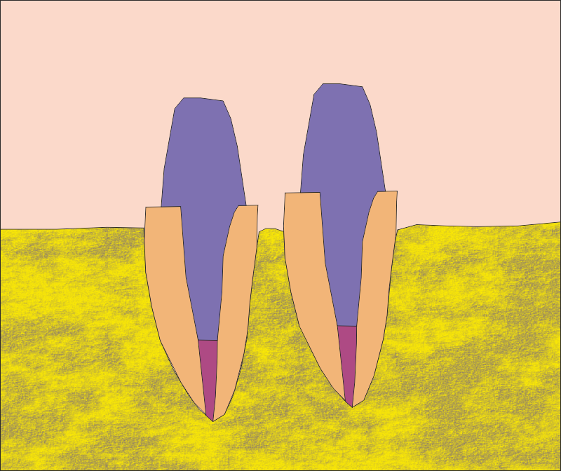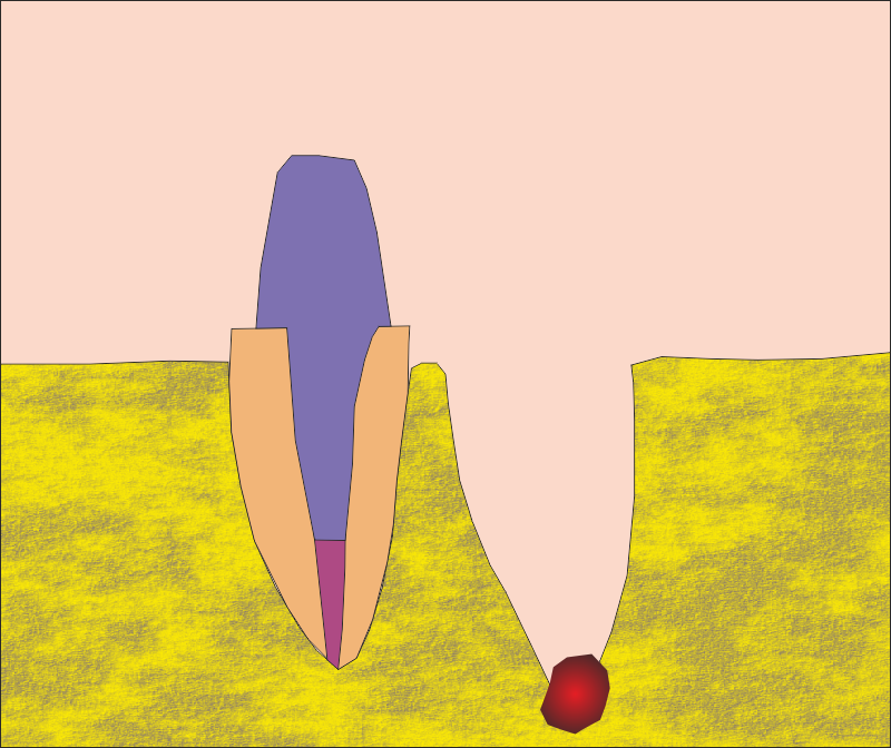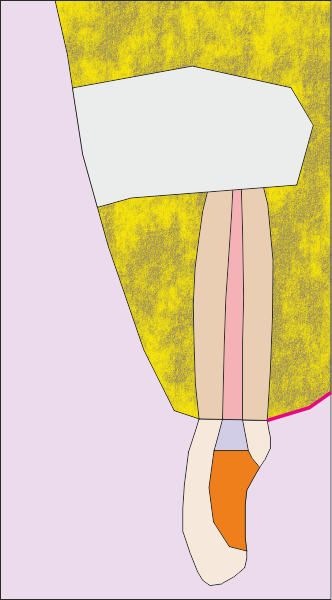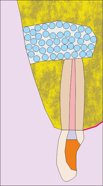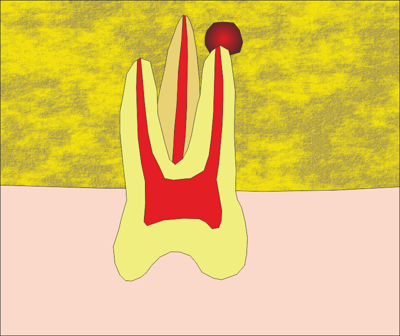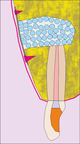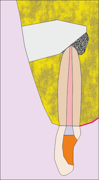 Първоначална ситуация - схема на хроничен локализиран или дифузен периапикален периодонтит, който подлежи на апикална остеотомия. Около апекса на зъбния корен се формира кухина, изпълнена с разпаднати тъкани и клетки на хроничното възпаление. На схемата горе тази кухина е означена с черно - бяла текстура. В огромен процент от случаите оперативният достъп се осъществява от вестибуларна посока - при което понякога се изисква отнемането на много голям костен обем, особено при долни странични зъби.
