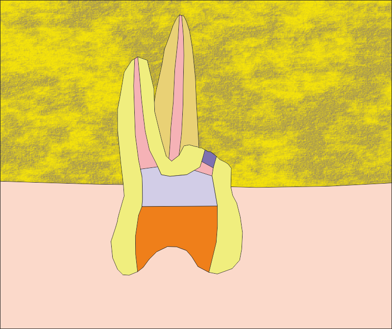 Горен молар с ампутация на медиовестибуларния корен. Необходимо е зъбът да се девитализира, тъй като при премахването на корена в пулпната кухина бързо ще навлезе инфекция по ретрограден път и ще се прояви клиничната симптоматика на пулпит. Колкото по-голяма част от корена се премахва, толкова повече се влошава прогнозата по отношение на преживяемостта на зъба - необходимо е остатъчната част от корена да бъде разположена изцяло в костни тъкани. При наличие на пародонтален джоб около корена, който подлежи на ампутация, е налице доста по-лоша прогноза - коренът на практика няма пародонтална задръжка и бързо се озовава само в пределите на меките тъкани. Около него се задържа зъбна плака, започват процеси на разпад и хронично възпаление, което бързо се разпространява в дълбочина и не след дълго зъбът се разклаща. Направляваната тъканна регенерация с помощта на изкуствена кост и колагенова мембрана или растежни фактори може да отложи за дълго време загубата на зъба, така че е удачно да се вземе предвид при изготвянето на съответния лечебен план. Колкото по-нагоре ще се ампутира един корен, толкова по-голям става луменът на канала и съответно толкова по-големи са индикациите за ретроградна заплънка - на схемата горе тя е означена със сиво - синьо, тъй като в миналото за това се е прилагал основно амалгама, а тя има подобен цвят. В днешно време голямо приложение за целта имат глазйономерните цименти, и разбира се, препаратите на основата на МТА. Също така при ампутация на корени е необходимо да се извърши внимателен оглед за евентуалното наличие на пукнатини (частични или пълни фрактури) на корена, при установяването на които в огромен процент от случаите е необходимо да се пристъпи към екстракцията на зъба.