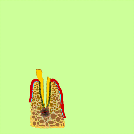 Анимирана схема на запълването на кореновия канал с класически каналопълнител - тип Лентуло. През изминалия ХХ век това беше най-често използваният метод за запълване на коренови канали - с препарат с пастообразна консистенция, който се нагнетява към физиологичния апикален отвор със спираловидния канален инструмент. Някои от пастите се втвърдяват след няколко часа или денонощие, а други остават пластични за период от месеци или години след запълването на канала. В случай че е налице периапикална лезия, както е на зъба на схемата, е възможно припресване на каналопълнежното средство в огнището на костен разпад, като някои лечебни методи дори изискват задължително това да се получи на практика. Съвременните схващания за протичане на оздравителния процес не налагат да се припресва каналопълнежна паста в гранулома или кистата - достатъчно е да се почисти триизмерно кореновият канал, при което бактериалната инвазия в периапикалната област спира и след известно време огнището на хронично възпаление изчезва.
